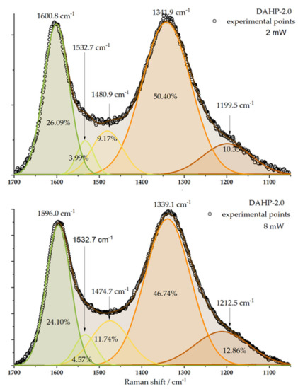 Deconvolution of Raman spectra of DAHP-2.0 sample is presented for the laser power of 2 and 8 mW. Positions of individual bands and their relative contributions to the overall signal in the considered wavenumber range are indicated.