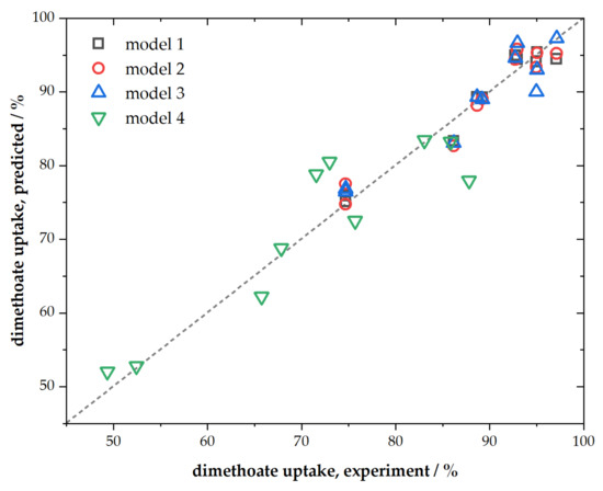 Presented ACFs were characterized by their chemical composition, textural properties, spectroscopic characteristics, and performance towards dimethoate removal. We chose simple multiple linear regression to link dimethoate removal under different conditions (as dependent variable) with materials’ chemical composition (C, O, and P content) and textural properties (SSA and Vtot) as independent variables. The regression analysis results are summarized in Table 4, while parity plots are given in Figure 5.