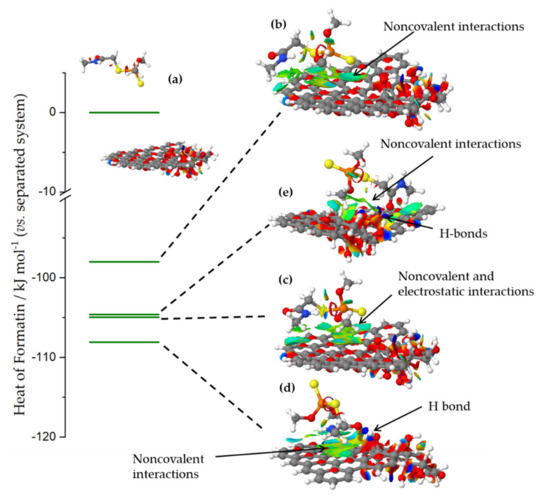 The heat of formation of different dimethoate–carbon surface configurations, relative to the system where dimethoate and carbon surface were separated so that no interactions occur. The systems were denoted (a–e) according to the order of discussion in the text (for the explanation check the text). Isosurfaces present the domains where non-covalent interactions were operative. The domains where different interactions were observed were indicated. The most stable configuration corresponded to the H-bond formed via carbonyl group in the dimethoate molecule, and additional stabilization took place through non-covalent interactions with the basal plane.