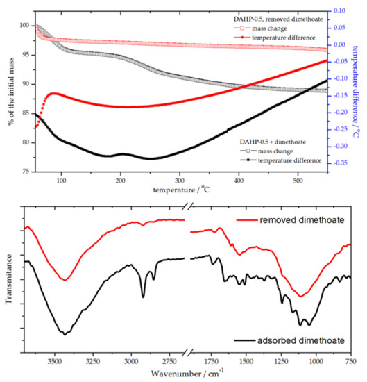 TG-DTA analysis of DAHP-0.5 before and after removing adsorbed dimethoate (upper panel) and the corresponding FTIR spectra (lower panel).