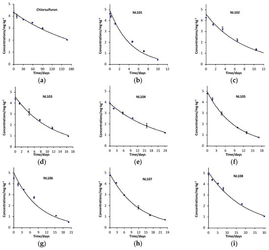 Degradation curve of target compounds (alkaline soil, pH 8.39). (a–i): Chlorsulfuron, NL101-NL108.