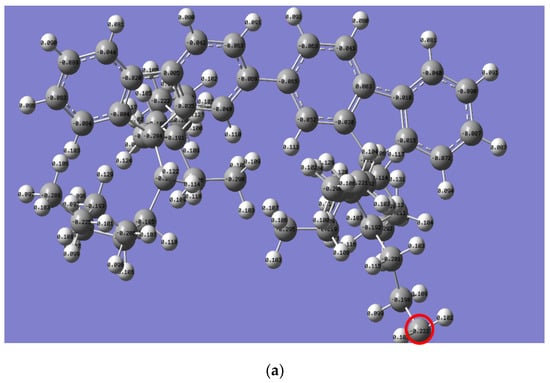 The Mulliken charge distribution revealed a significant difference in the reactivity of the alkyl side chain for both polymers, as presented in Figure 6. Interestingly, the electron charge of the last carbon in the n-alkyl side chain for PFO-1 is lower than that of PFO-2 (highlighted by a red circle). Thus, their electrophilicity is higher than the corresponding PFO-2. Consequently, PFO-1 has a greater ability to form CH-π bonds.