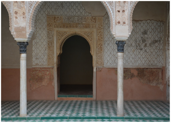 The Alhambra Monumental Ensemble at Granada (Spain) holds some of the few palaces to have survived from medieval Islamic times. This architectural complex, with its intricate succession of rooms and courts, gardens, fountains, and watercourses, is one of the most magnificent examples of Islamic architecture. It illustrates superbly the contrast between an unassuming exterior and a richly decorated interior. Nasrid arts grew from Almohad traditions, but displayed far more variety and splendor than their precursors. Tiling, together with carved and painted plasterwork, particularly in the form of mocarabes domes, are the most popular decorative revetments from Nasrid art. However, other less well-known architectural decorative solutions were also employed, as is the case with wall paintings. Mural painting in the Alhambra has a certain quantitative and qualitative entity, although it is not well known by most visitors. Most of these paintings are not part of the established circuits, probably due to their location in small rooms (like the paintings of the Partal house) and their precarious state of conservation [1]. The custom of painting walls with ornamental purposes can be traced back to earlier cultures. In Hellenistic times, decorative mural plastering was already used, a technique that survived through Roman art [2,3,4] with representative examples in the Iberian Peninsula [5]. Also in the Middle East, there was an important tradition of mural painting. Both precedents could have an influence on Hispano-Muslim mural painting. Wall painting in the Alhambra can be found in exterior walls and some other architectural elements like vaults, mainly in the form of faked breaking of bricks in red [6]. However, it stands out especially in the decoration of the wall socles, in rooms reserved for domestic activities and private places. Thus, in Nasrid architecture the tiled socles preferably occupy the official spaces of the palace, reserving the painted ones for more intimate rooms [1].