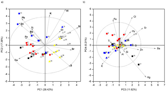 PCA results on XRF data. Biplots of scores and loadings for (a) PC1 versus PC2 and (b) PC3 versus PC4. Measurement points (scores) are labeled according to the color of the visual inspection and the support. Labelling: blue (■), red (■), and black (■) motifs in the socles; plasterwork substrate (▲) and white finishing layer (▲) in plasterwork.