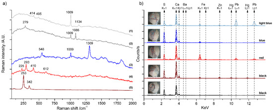 Representative spectra registered during the in situ study. (a) Raman spectra of different compounds identified in situ: (1) gypsum; (2) calcite with gypsum; (3) lapis lazuli; (4) hematite; (5) cinnabar. (b) XRF spectra (with filters for light, low and high ranges) of different motifs labeled with the macro-observed color. Inset images correspond to the analyzed area (marked with a red circle).