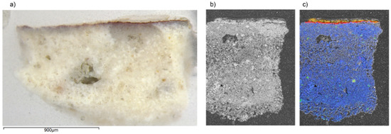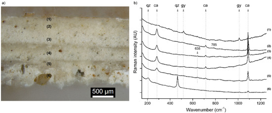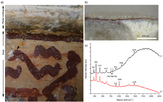 A clear distinction between XRF measurements on plasterwork and those on mural painting is observed along the axis defined by PC1 (28.42% of variance explained). Plasterwork samples (labeled with triangles in Figure 2) show positive scores values, whereas mural painting locations (labeled with squares) show mostly negative ones. Inspection of the loadings in the biplot revealed that the S and Sr contents are higher in the plasterwork motifs of the wall, while Ca is more abundant in the mural paintings of the socles. Thus, this component reflects the differences between the socle and the plasterwork substrates based on gypsum plaster and lime plaster, respectively. These findings are supported by Raman spectroscopy. As can be seen in Figure 3a, the spectral features of pure gypsum (CaSO4·2H2O, spectrum 1) were registered on plasterwork in the upper walls. The presence of Sr, and its abundance in the plasterwork, can be explained because it is a common impurity in natural gypsum. Sr can be either a substitute of Ca ions in the crystalline structure of gypsum or forming a different mineral phase, celestine (SrSO4). We also confirmed the presence of calcite (CaCO3) in different areas of the mural paintings regardless of the color by Raman spectroscopy (see Figure 3a). However, gypsum was also detected in these locations. The presence of calcite can be attributed to the underlying substrate based on lime plaster, whereas the presence of gypsum could be due to impurities of the lime, intentional addition or even degradation processes due to atmospheric contamination. This point is further clarified with the study of the stratigraphy of the decorations on sample cross-sections (see Section 2.2). Finally, it is interesting to note that Sr is a clue element in the PCA differentiation between locations on gypsum plasterwork (positive scores for PC1) and mural painting locations (negative scores for PC1). This is consistent with the fact that Ca substitution by Sr (with larger ionic radius) is not favored in the calcite structure [33].