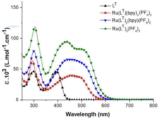 UV-vis absorption spectra of LT and [Ru(LT)3-n(bpy)n]2+ (n = 0–2) complexes in THF.