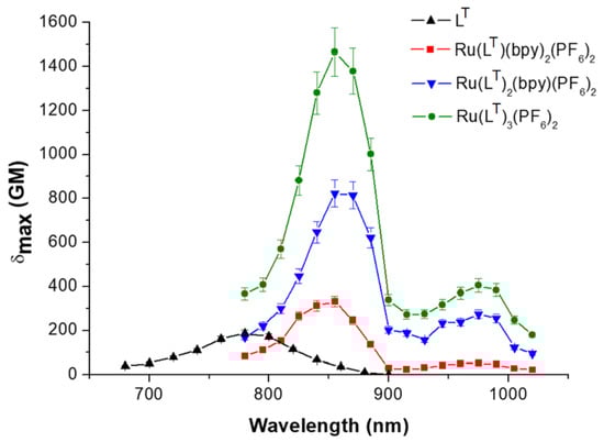 While the λmaxTPA vary only slightly within each series, a significant increase of the δmax values, corresponding to maxima located in the 775–900 nm window, can be observed when comparing the variations from [Ru(bpy)3]2+ to the [RuL3-n(bpy)n]2+ complexes (Table 2). On the other hand, the highest difference between the experimental δmax values for the free ligands and the corresponding [RuL(bpy)2]2+ complexes is observed for [RuLF(bpy)2]2+ (approximately 390 GM), and the lowest gap for [RuLT(bpy)2]2+ (approximately 125 GM).