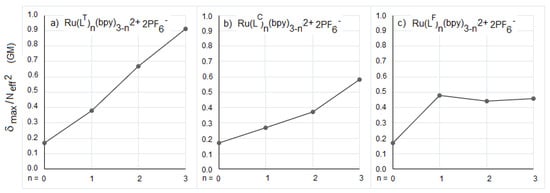 (a–c). Evolution of intrinsic TPA cross-sections as a function of the number of ligands, LT (a), LC (b), and LF (c), in [RuL3-n(bpy)n]2+ complexes. Ru(bpy)32+ acts as a reference (n = 0) [46].