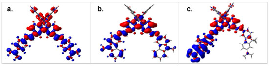 A simple additive effect that would have the ILCTs as its unique origin cannot account for the evolution of the cross-section values reported for the RuLT and RuLC series. We assume that their increase from one complex to another, within each of these series, results from prominent ILCT summative effects together with MLCT and LLCT auxiliary contributions, with the metal center acting beyond a simple aggregator. This specific role will be especially important if the metallic contributions to the HOMOs and LUMOs involved in the transitions giving rise to TPA are significant, as observed for the LT and LC series.
