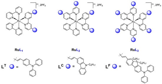 The homoleptic and heteroleptic [RuL3-n(bpy)n]2+ (PF6−)2 (n = 0, 1, 2) complexes (Scheme 1) were designed on the basis of 2,2′-bipyridine ligands, L = LT, LC, LF, where the bipyridine cores are 4,4′-substituted by various electron-rich arylamine groups such as triphenylamine (LT), carbazolyl (LC), and diphenylamino-fluorenyl (LF) subunits, through a vinylene linker [47]. The triphenylamine and carbazolyl groups were selected as electron-donating substituents, which would not only modify the D-π-A conjugation, but also tune the architectures in the quadrupolar D-π-A-A-π-D sub-chromophores [27,28]. Similarly, the fluorenyl based ligand (LF) was designed because of the utility of fluorenyl units in extending the conjugation length in TPA molecules due to their planar structure [50].