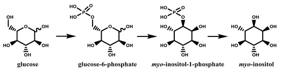 As mentioned earlier, inositols can be found not only as widespread compounds within the vegetable kingdom but also in mammals, including human beings [5], this contributes in defining them as primary metabolites, just like sugars from which they derive. The numerous studies on inositol metabolism converge around the biosynthesis of myo-inositol, the most omnipresent of these compounds, its subsequent epimerization to other inositols, its methylation to give many O-methyl esters, incorporation into cell walls, and so on [37]. In addition, the discovery that myo-inositol plays a pivotal role in growth and development of plants, microorganisms and certain yeasts further prompted renewed interest in its biochemical and biological features. Nowadays, it is known that myo-inositol derives directly from d-glucose (in the form of d-glucose-6-phosphate); briefly, this conversion involves the cyclization of d-glucose-6-phosphate to inositol 3 phosphate, the loss of phosphate and the final release of free myo-inositol (Figure 5). This two-step pathway is the only recognized for myo-inositol biosynthesis in algae, fungi, cyanobacteria, higher plants and animals. All known inositols, including stereoisomers and derivatives are the results of metabolic processes on this unique molecule [38].