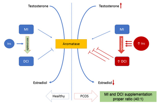 Biological functions of myo-inositol (MI) and d-chiro-inositol (DCI) on estrogen and androgen biosynthesis in ovarian granulosa cells of healthy and PCOS women (Ins = insulin).