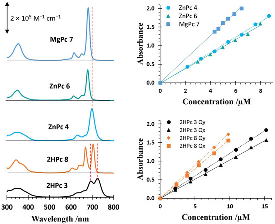 Adherence of the Q-bands to the Beer–Lambert law (Figure 2) implies that all phthalocyanines remain unaggregated up to at least 6 µM in THF at the spectrum recording temperature. Figures S16–S20 in the Supporting Information show that the Soret band also follows the Beer–Lambert law.