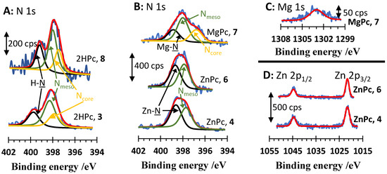 Figure 3 displays the X-ray photoelectron spectra (XPS) of the nitrogen 1s, magnesium 1s, and zinc 2p envelopes for all phthalocyanines. Data extracted from Figure 3 is summarised in Table 2.