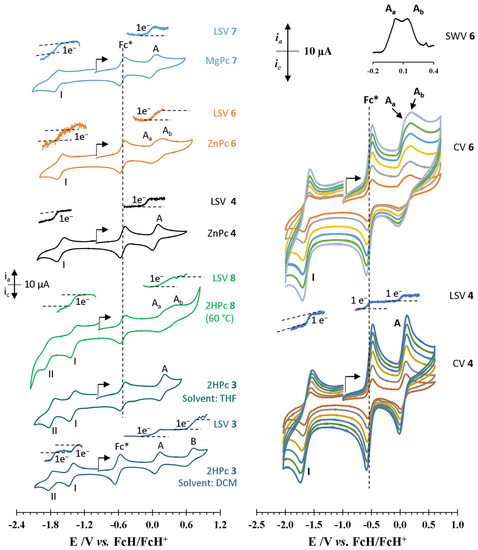 Electrochemical reversibility for one-electron transfer processes is characterised by ΔEp = Epa − Epc = 59 mV [29]. All redox processes labelled A (anodic waves), I, and II (cathodic waves) for 3, 4, and 6–8 exhibit quasi electrochemical reversibility at slow scan rates, with 78 < ΔEpa < 135 mV (Table 3), but approach chemical reversibility (i.e., current ratios approached unity) with 0.83 < ipa/ipc < 1.00. In the THF potential window, only one of the two possible oxidation couples, wave A, was observed. As is well-known and -documented in literature [3,7,15], these phthalocyanine ring-based redox processes are all one-electron transfer processes. In this study, we report the linear sweep voltammetry (LSV) of compounds 3, 4, 6, 7, and 8 in Figure 4. The LSV show that the number of electrons transferred is the same for the observed oxidation and reduction waves; since it is known that the phthalocyanines ring-based processes are one-electron processes, it can also be extrapolated to all main waves of the present compounds studied. In the case of compound 8, the combined wave Aa and Ab gives an LSV wave of equal size to that of the other one-electron reduction wave. The LSV of the second reduction wave, wave II, is not always shown, since decomposition in many cases occurred on LSV time-scale, and wave II could not be observed on the LSV scans. Additionally, the peak current (ip) values of ring-based processes are all of approximately equal size, as can be seen from Figure 4 and Table 3. Peak currents are the analytical quantity measured for concentration in the Randles Cevcik equation. Together with the LSV results, peak current values are, therefore, also mutually consistent with all ring-based oxidation and reduction waves being one-electron transfer processes.