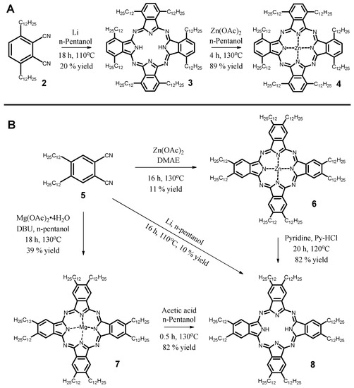 - Swarts, J.C.; Langner, E.H.G.; Krokeide-Hove, N.; Cook, M.J. Synthesis and Electrochemical Characterisation of Some Long Chain 1,4,8,11,15,18,22,25-Octa-Alkylated Metal-Free and Zinc Phthalocyanines Possessing Discotic Liquid Crystalline Properties. J. Mater. Chem. 2001, 11, 434–443. [Google Scholar] [CrossRef]