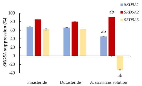 The effects of 0.1 mg/mL of finasteride and dutasteride, and 0.5 mg/mL of A. racemosus Willd. root extract solution on 5-alpha reductase isoenzymes expression (SRD5A) in human prostate cancer cells. The percentage of SRD5A suppression was compared with the control. Statistical significance in comparison to finasteride and dutasteride is indicated as “a” and “b”, respectively (p < 0.05).