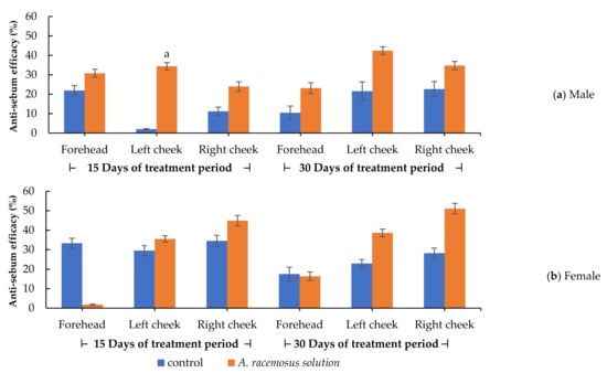 All volunteers thoroughly accomplished the study protocol. This study compared 5% w/v of A. racemosus root extract (A. racemosus extract solution) with control (5% of propylene glycol). The facial sebum contents were measured by Sebumeter®, which is a widely accepted technique [54]. The results of the percent changes in facial sebum production as anti-sebum efficacy values are illustrated in Figure 2. The A. racemosus extract solution group showed a higher anti-sebum effect than that of the control group in both groups (male and female) at both time intervals (15 and 30 days of treatment). In particular, after 15 days of application, male volunteers in the A. racemosus extract solution group showed significantly higher anti-sebum efficacy values on the left cheek area than those of the control group (p < 0.05), as shown in Figure 2a. The A. racemosus extract solution group demonstrated better anti-sebum efficacy on the left and right cheek areas than that at the forehead area in both groups (male and female). Figure 2b shows that the anti-sebum efficacy of the A. racemosus extract solution group in female volunteers was higher than that in the control group on the right and left cheeks at both time intervals (15 and 30 days of treatment). This might be due to the sensitivity of the sebaceous glands to 5-alpha reductase inhibitors in each specific area. The higher sensitivity of the sebaceous glands on the cheeks to the A. racemosus extract than the sensitivity of those on the forehead leads to a lower amount of sebum production on both cheeks. A significant anti-sebum effect was only found in male volunteers. A lower amount of facial sebaceous glands and smaller sebaceous units are found in females [48,55], which may have led to the lower sensitivity of the androgen receptor to anti-androgen compounds and the lower anti-sebum efficacy of female volunteers in this study. A previous study reported that androgen levels in females are lower than in males [56]. The proliferation of sebocytes is stimulated by androgen, resulting in a larger sebaceous gland and a higher level of sebum production in males than in females [56]. These reasons could explain the better response of males over females to the A. racemosus root extract.