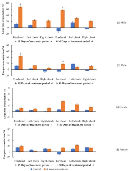 Pore area reduction of the control (5% of propylene glycol) and the 5% of Asparagus racemosus Willd. root extract solution groups on forehead, left cheek, and right cheek. (a) Large and (b) fine pore area reduction after 15 days and 30 days of treatment periods in male volunteers. (c) Large and (d) fine pore area reduction after 15 days and 30 days of treatment periods in female volunteers. Statistical significance in comparison to the control is indicated as “a” (p < 0.05).
