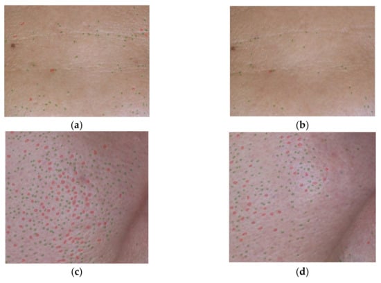 An example of pore area visualization from the A. racemosus Willd. root extract solution treatment using VisioFace® CSI software (Köln, Germany) (a) before and (b) after 30 days of the extract treatment on forehead; (c) before and (d) after 30 days of the extract treatment on right cheek. Red spots = large pores; green spots = fine pores.