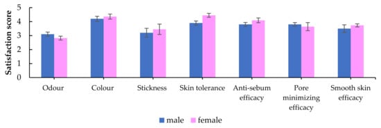 For a subjective assessment, the results of the volunteers’ satisfaction of product characteristics, skin tolerance, and efficacy are shown in Figure 5. All volunteers from the A. racemosus extract groups stated that the extract solution had great potential to decease facial grease, minimize pore sizes, and provide smoother skin. However, the unique odor of the A. racemosus extract was not satisfactory.