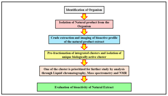 The application of advanced analytical techniques begins with the screening of crude drug extracts, followed by further isolation and identification of a bioactive molecule that is fractionated to obtain the active moiety from the natural product [28]. The isolation of a bioactive compound is a laborious task and is highly challenging. The molecule isolated is run through the extract libraries and further exposed to high throughput screening so that the crude extract can be pre-fractionated into subfractions that are more suitable for the system that handles automated liquids [3]. The methods of fractionation can be altered to obtain preferential subfractions with active compound drugs that are alike in nature. This process can increase the number of hits compared with the compounds obtained from crude extracts, which enables more efficient and promising hits [6]. An advance in the instrumentation used in analytical methods, combined with advanced computational approaches, can lead to isolation of possible analogue structures of natural products [29]. The precise information about the metabolic composition of the crude marine extract can be obtained through metabolomics, which helps in prioritizing the isolation of a compound and its dereplication to annotate the structural analogues of the newly derived product [30] (Figure 1).