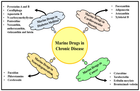 Drug molecules derived from marines sources are highly heterogenous in nature due to the abundant coverage of oceans, which thereby host the lives of a wide diversity of species [1,2]. In a pharmacological preclinical study, about 75 natural compounds that were isolated from marine organisms significantly showed biological and therapeutic activities [3,4]. The first marine drug from the cone snail peptide—namely, ziconotide, under the trade name Prialt—was approved in 2004 in the United States for the management of spinal cord injury, mediating chronic pain. Later, in 2007, another marine product named trabectedin, a sea squirt metabolite, was also approved by the European Union for the treatment of soft tissue sarcoma [5]. The drugs obtained from marine sources have displayed an exceptional potential in the management of various types of chronic diseases, including cancer, due to their potent anticancer activities [5,6,7]. These drugs have also gained the great interest of those developing new antimicrobial agents. Sponges belonging to the phylum Porifera, are the oldest and most prolific marine organisms on the planet. Demospongiae, a class of Porifera, account for 83% of the species with the highest number of bioactive compounds [8]. Another marine genus named Lendenfeldia is rich in sulfated steroids, and its metabolites possess anti-HIV, anti-inflammatory, antitumor, and antifouling activities. Drug discovery programs have significantly increased their exploration of lead molecules from marine natural products, and a higher number of bioactive products have been screened for their activity and are under development in clinical trials [9]. Terrestrial plants such as digitalis, morphine, and many other natural compounds have served as drug molecule since olden times. However, the modern pharmaceutical industry has expanded a keen interest in developing drug molecules from marine sources, as they are believed to provide more novel and potent drug compounds since they can survive under extreme conditions, such as the photodynamic and extreme temperatures, pressure, and oxidative stress of the ocean [10]. The basic scientific research in pharmacology and chemistry of marine-derived natural products mainly began in the early 1970s and has now finally begun to bear fruit due to advances in analytical and screening techniques that have fastened the drug discovery process [11]. The current review highlights the drugs obtained from marine natural products and their role in the treatment and management of chronic diseases such as cardiovascular and neurodegenerative diseases, diabetes mellitus, and cancer. These drugs offer a look into the future of promising products that can be obtained from the sea.