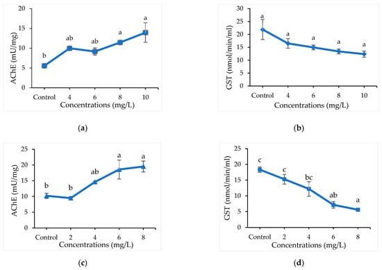 Detoxification enzyme inhibition activities: AChE (a) and GST (b) in C. chinensis; AChE (c) and GST (d) in C. maculatus treated with A. maritima oil; Bars represents a standard error (±SE) of three replications; Means followed by the same letters within a figure do not differ significantly by Tukey’s HSD (p ≤ 0.05).