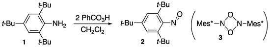 As shown in Scheme 1, Okazaki and Inamoto [1] found that 2,4,6-tri-t-butylaniline (1) is oxidized with 2 moles of perbenzoic acid in dichloromethane to yield the corresponding nitrosobenzene (2), which is stable in air at room temperature and can be purified by column chromatography with alumina. In contrast to normal nitroso compounds such as unsubstituted nitrosobenzene, compound 2 is emerald green and does not dimerize to 1,3,2,4-dioxadiazetidine (3) either in solution or the solid state due to the steric hindrance. In general, the steric protection technique seems promising for the stabilization of unstable compounds.