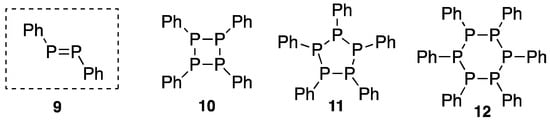 “Phosphobenzene (9)” was reported by Köhler and Michaelis [4] as the phosphorus analogue of azobenzene. Later, however, it was revealed that the structure of this compound 9 comprised oligomers such as 10 [5,6], 11 [7,8], and 12 [9,10] according to the molecular weight determination and X-ray analysis (Scheme 3). Since then, it has been believed that such compounds with double bonds involving heavier main group elements never existed as stable compounds.