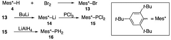 As shown in Scheme 4, 1,3,5-tri-t-butylbezene (4) is brominated to yield 1-bromo-2,4,6-tri-t-butylbenzene (13) and is converted to 2,4,6-tri-t-butylphenylphosphonous dichloride (15) after a halogen–metal exchange with butyllithium, thus yielding 14 followed by the addition of phosphorus trichloride. Dichloride 15 reacts with lithium aluminum hydride to yield 2,4,6-tri-t-butylphenylphosphane (16). It should be noted that both bulky phosphorus compounds 15 and 16 are stable, easy to handle in air at room temperature, and can serve as appropriate starting materials for the study of low-coordinate organophosphorus compounds [11].