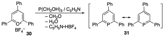 In 1966, Märkl reported the interesting preparation of a stable phosphorus-containing heterocyclic compound from 2,4,6-triphenylpyrylium tetrafluoroborate (30) [43]. The obtained triphenylphosphabenzene (or phosphinine) (31) contains a P=C bond in its canonical form, but the stability is estimated to be due to delocalization or aromaticity (Scheme 10).