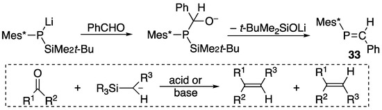 Alternatively, more sterically protected phosphaethenes with Mes* around phosphorus can be prepared by another method such as the phospha-Peterson reaction starting from silylphosphide and carbonyl compounds, thus successively preparing (E)-2-phenyl-1-(2,4,6-tri-t-butylphenyl)-1-phosphaethene (33), as shown in Scheme 12 [45].