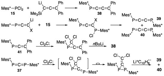 As shown in Scheme 19 (third and fourth rows), the Doering–Moore–Skattebøl method can be applied to the P=C=C and P=C=P systems (41 and 37) to yield 1-phospha-1,2,3-butatriene 38 [49] and 1,4-diphospha-1,2,3-butatrienes (39 and 40, ca 4:1) [51], respectively, which implies that two carbon atoms are inserted into P=C and P=P in a stepwise manner. Additionally, Märkl described the preparation of extended cumulenes (38–40) from 2,4,6-tri-t-butylphenylphosphonous dichloride (15) and allenyllithium compounds as nucleophiles (Scheme 19, first and second rows) [50,52].