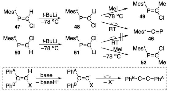 Alternatively, phosphaethyne (46) can be prepared by an interesting rearrangement reaction, a phosphorus version of the Fritsch–Buttenberg–Wiechell rearrangement, as shown in Scheme 22 [66,67,68]. (E)-2-Chloro-1-(2,4,6-tri-t-butylphenyl)phosphaethene (47) is metalated to 48 with t-butyllithium at −78 °C, and the metalation is confirmed by methylation with iodomethane at that temperature to yield (E)-2-chloro-1-(2,4,6-tri-t-butylphenyl)-1-phosphapropene (49). However, after metalation, when 48 is allowed to warm up to room temperature, phosphaethyne 46 is obtained, indicating that the Mes* group migrates from phosphorus to carbon. On the other hand, if (Z)-2-chloro-1-(2,4,6-tri-t-butylphenyl)phosphaethene (50) is allowed to react with t-butyllithium, the obtained lithium compound (51) does not lead to phosphaethyne 46, while the formed alkylation product, (Z)-2-chloro-1-(2,4,6-tri-t-butylphenyl)-1-phosphapropene (52), indicates that the configuration is retained [67]. Based on a kinetic study of the Fritsch–Buttenberg–Wiechell rearrangement shown at the bottom of Scheme 22, Köbrich [69] suggested that phenyl group PhA migrates from one carbon to another, thus eliminating trans-halogen atom as halide to form acetylene [70].
