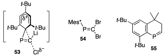 In this rearrangement process from 47 to 46, a similar transition state such as 53 might be involved (Scheme 23). Appel [71] reported the formation of 46 from 2,2-dibromo-1-(2,4,6-tri-t-butylphenyl)phosphaethene (54), though it is not certain if phosphanylidenecarbenes such as 56 or 57 (Scheme 24) are involved in this formation of phosphaalkyne, whereas the carbene, if freely generated, is experimentally [72] and theoretically [73] known to yield an intramolecular insertion product such as 55.