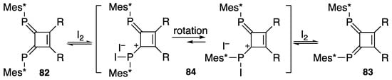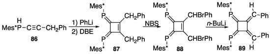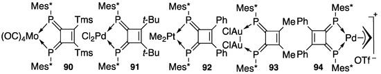 - Yoshifuji, M. Chemistry of diphosphinidenecyclobutenes. J. Synth. Org. Chem. Jpn. 2003, 61, 1116–1123. [Google Scholar] [CrossRef]