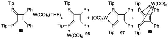 - Yoshifuji, M.; Ichikawa, Y.; Yamada, N.; Toyota, K. Preparation and X-ray analysis of novel carbonyltungsten(0) complexes of diphosphinidenecyclobutenes. Chem. Commun. 1998, 1, 27–28. [Google Scholar] [CrossRef]