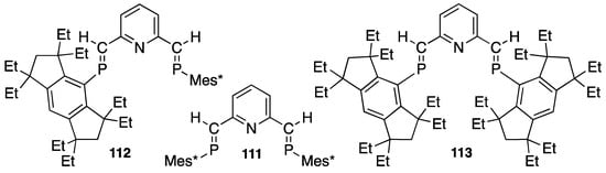 - Taguchi, H.; Takeuchi, K.; Tsujimoto, S.; Matsuo, T.; Tanaka, H.; Yoshizawa, K.; Ozawa, F. Unsymmetrical PNP-pincer type phosphaalkene ligands protected by a fused-ring bulky Eind group: Synthesis and applications to Rh(I) and Ir(I) complexes. Organometallics 2016, 35, 1526–1533. [Google Scholar] [CrossRef]