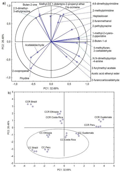 Projection of variables (main volatile compounds characterizing the CC and CCR coffee roasting process) on the PC1 and PC2 factor plane—(a); projection of cases (coffee beans from Brazil, Ethiopia, Guatemala, Costa Rica, and Peru roasted in the CC and CCR roasters) on the PC1 and PC2 factor plane—(b).