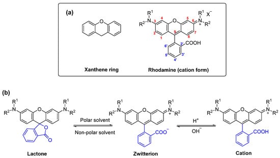 (a) General structure of xanthene and rhodamine dyes; (b) Molecular structures of three rhodamine forms in equilibrium.