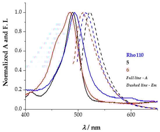 Normalized absorption and emission spectra of Rho110 (blue), 5 (black, quinoid form) and 6 (red, quinoid form) in CH2Cl2 at 25 °C (full line—absorption spectra; dashed line—emission spectra).