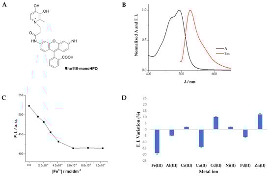 (A) Structure of the hydrochloride salt of Rho110-monoHPO; (B) Normalized absorption and emission spectra in MOPS pH = 7.40 of Rho110-monoHPO, at 25 °C; (C) Fluorescence decrease with increasing Fe(III) concentrations (aqueous solution, pH = 5), [Rho110-monoHPO] = 1.0 × 10−5 M; (D) Fluorescence intensity variation (%) for the metal ions studied (Fe(III), Al(III), Cr(III), Cu(II), Cd(II), Ni(II), Pd(II), and Zn(II) with Rho110-monoHPO, in deionized water (pH = 5) at 25 °C [Rho110-monoHPO] = 1.0 × 10−5 M; 1:1 (Rho110-monoHPO:metal ion).