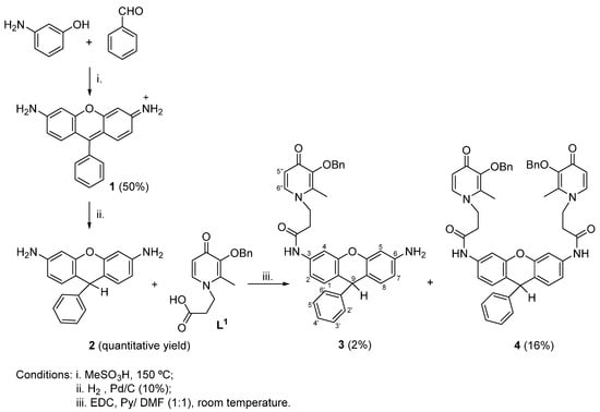 Next, we tested the amide coupling reaction of rosamine 1 with the carboxypropyl pyridinone L1, but no reaction was observed. We assumed that through the reduction of the xanthene core the reactivity of the nitrogen atoms at positions 3 and 6 of the xanthene would increase, allowing the coupling with carboxylic acids using mild conditions. Accordingly, we performed the reduction of rosamine 1 by catalytic hydrogenation (H2, 10% Pd/C), to give quantitatively the dihydrorosamine 2. Subsequently, the reaction of 2 with the carboxypropyl pyridinone L1 (2.6 equiv.) using N-(3-dimethylaminopropyl)-N′-ethylcarbodiimide hydrochloride (EDC) in a 1:1 mixture of anhydrous pyridine (Py) and DMF [20] furnished the mono- and di-functionalized derivatives 3 and 4 in 2% and 16% of yield, respectively (Scheme 1). It is important to mention that, in addition to the desired conjugates 3 and 4, the control by TLC analysis of the reaction mixture revealed the presence of other compounds, including (i) starting unreacted dihydrorosamine 2, (ii) rosamine 1 probably regenerated during the reaction and/or during the TLC plate elution through contact with the silica gel used as a stationary phase, and (iii) other minor by-products. These observations revealed that the reaction conversion is not complete, and that the compounds obtained are unstable (tendency to oxidize), which explains the low yields obtained by this approach.