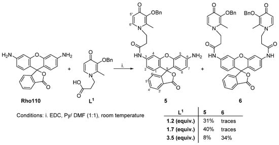 In order to find a more efficient approach, we decided to replace dihydrorosamine 2 by the commercially available Rhodamine 110 (Rho110). Rho110 contains two active amino groups, the ortho-carboxyl group in the phenyl ring and can exist in equilibrium of the “open” quinoid and “closed” lactone forms, being the “closed” lactone form typically more reactive for synthetic proposes. The condensation of Rho110 with 1.2 equiv. of L1, using EDC in Py/DMF (1:1) was achieved at room temperature for 24 h (Scheme 2). After the preparative thin-layer chromatographic purification, the mono-functionalized derivative 5 was isolated in 31% of yield. In addition, 55% of Rho110 was recovered unchanged, along with traces of the di-functionalized derivative 6. The use of a bigger amount of L1 (1.7 equiv.) led to the formation of 5 in 40% of the yield, while only traces of 6 were detected. Finally, when the reaction was carried out with a significant excess of L1 (3.5 equiv.), conjugates 5 and 6 were isolated in 8% and 34% yields, respectively. Note that in all these cases, the mono- and di-functionalized derivatives were isolated mainly in “closed” lactone.