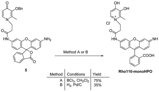 Therefore, we decided to proceed with the deprotection of the benzyl group for derivative 5, using the Lewis acid boron trichloride (BCl3), which allowed the isolation of the desired hydrochloride salt of Rho110-monoHPO in 75% of the yield (Scheme 3, Method A). Being milder and less acidic, the treatment under hydrogen atmosphere over 10% Pd/C was also attempted to deprotect 5. An orange powder was isolated, which after 1H NMR analysis revealed to be the deprotected compound in the reduced form (H insertion in position 9 of the xanthene). Keeping this derivative in the solution at room temperature for 24 h, we found that it can be totally converted into the oxidized form, without any further treatment, affording Rho110-monoHPO in 35% of the yield (Scheme 3, Method B).