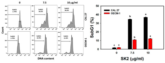 SK2 causes sub-G1 accumulation in oral cancer cells. DNA-content detections and statistics are provided. Cells were exposed to SK2 (0 (0.1% DMSO), 7.5, and 10 µg/mL) for 24 h. Data (means ± SDs; n = 3) without overlapping characters differed significantly (p < 0.05). For an example of CAL 27 and OECM-1 cells, different concentrations with different characters produced significantly different results. For CAL 27 and OECM-1 cells, for SK2 at 0, 7.5, and 10 µg/mL, “c, b, and a” indicate significant differences because the results did not overlap.