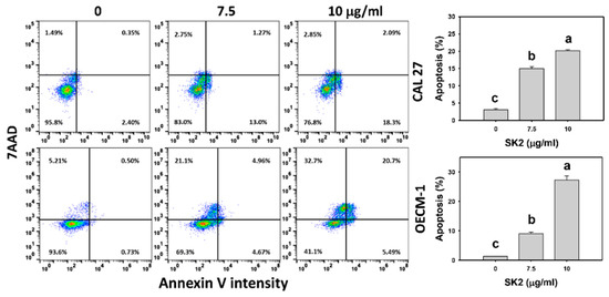 SK2 triggers apoptosis in oral cancer cells. Annexin V/7AAD detections and statistics are provided. Cells were exposed to SK2 (0 (0.1% DMSO), 7.5, and 10 µg/mL) for 24 h. Annexin V(+)/7AAD (+ or −) was regarded as the apoptosis %. Data (means ± SDs; n = 3) without overlapping characters differed significantly (p < 0.05). For an example of CAL 27 and OECM-1 cells, different concentrations with different characters produced significantly different results. For CAL 27 and OECM-1 cells, for SK2 at 0, 7.5, and 10 µg/mL, “c, b, and a” indicate significant differences because the data did not overlap.