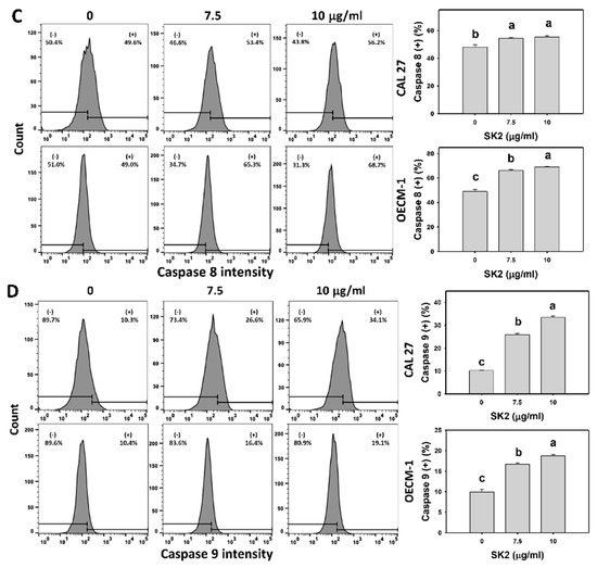 SK2 triggers caspase signaling in oral cancer cells. (A–D) Pancaspase and Cas 3, 8, and 9 detections, and statistics are provided. Cells were exposed to SK2 (0 (0.1% DMSO), 7.5, and 10 µg/mL) for 24 h. (+) shown in each panel represents pancaspase and Cas 3, 8, and 9 (+). Data (means ± SDs; n = 3) without overlapping characters differed significantly (p < 0.05). For CAL 27 and OECM-1 cells (D), for SK2 at 0, 7.5, and 10 µg/mL, “c, b, and a” indicate significant differences because the data did not overlap. For an example of CAL 27 cells (B,C), for SK2 at 7.5 and 10 µg/mL, the same letter “a” indicates non-significant differences because the data overlapped.